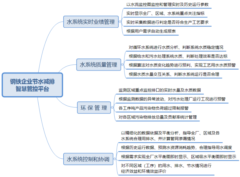 鋼鐵企業(yè)節(jié)水減排智慧管控平臺(tái)功能主要包括有:水系統(tǒng)實(shí)時(shí)業(yè)績(jī)管理、水處理質(zhì)量管理、環(huán)保管理、水資源控制和協(xié)調(diào)、運(yùn)維管理。