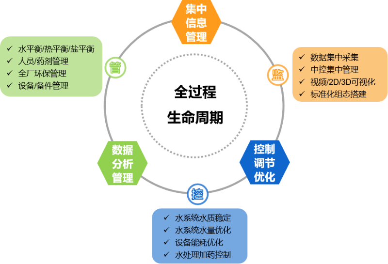 (2)全流程覆蓋:管控平臺(tái)涵蓋全流程生產(chǎn)鏈條,具備水系統(tǒng)實(shí)時(shí)監(jiān)控、水處理運(yùn)行分析及管理、環(huán)保管理、水系統(tǒng)實(shí)時(shí)平衡及優(yōu)化協(xié)調(diào)、水系統(tǒng)業(yè)績(jī)分析及統(tǒng)計(jì)等功能。