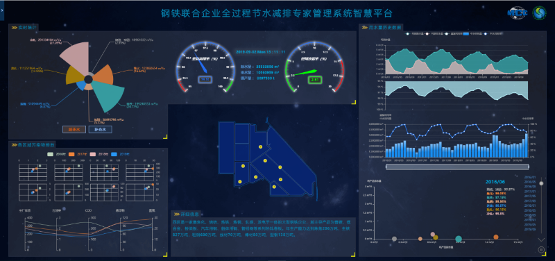 平臺(tái)自投運(yùn)以來(lái),以其高效、快捷、精準(zhǔn)的特點(diǎn),以全廠、區(qū)域、水系統(tǒng)三級(jí)管理,涵蓋了邯鋼西區(qū)焦化、燒結(jié)、煉鐵、煉鋼、軋鋼各個(gè)生產(chǎn)工序的用排水系統(tǒng)以及水處理、綜合污水處理系統(tǒng),以其高效、快捷、精準(zhǔn)的特點(diǎn),實(shí)現(xiàn)了鋼鐵園區(qū)全生命周期水系統(tǒng)運(yùn)行、能源管理、環(huán)保管理、數(shù)據(jù)統(tǒng)計(jì)分析以及廠區(qū)內(nèi)水平衡調(diào)控的智能化、數(shù)據(jù)化、可視化,保障了供水安全,優(yōu)化了用水結(jié)構(gòu),提高了濃縮倍數(shù),節(jié)省了藥劑消耗,降低了用排水量。據(jù)測(cè)算,實(shí)現(xiàn)綜合節(jié)水5%~10%,節(jié)省水處理運(yùn)行費(fèi)用10%以上。
