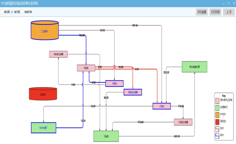 利用水質(zhì)水量平衡優(yōu)化算法,通過(guò)對(duì)區(qū)域、濃鹽水產(chǎn)生與處理、處理單元和處理子單元的計(jì)算,搭建允許多種約束條件、允許人工調(diào)整、區(qū)分內(nèi)外部水流的模型規(guī)則,最終完成涵蓋原水處理、用水處理、污水處理的全生命用水周期水質(zhì)水量平衡計(jì)算,實(shí)現(xiàn)鋼鐵企業(yè)全廠水平衡智能計(jì)算及指導(dǎo)。