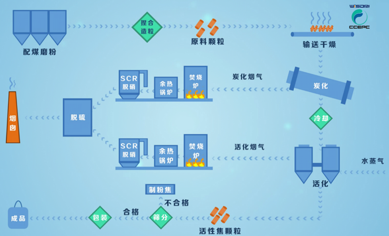 上述前4個(gè)問題均與活性焦性能相關(guān),因此,提升活性焦性能是解決上述問題的主要途徑之一,而高性能活性焦的制備亦存在如下問題:1)對原料煤種粘結(jié)指數(shù)要求較高,煤種選擇范圍窄、價(jià)格較貴;2)活性焦生產(chǎn)流程較長,氣氛、溫度、流量等關(guān)鍵生產(chǎn)參數(shù)多且復(fù)雜,缺乏準(zhǔn)確控制手段,存在配料堵塞、配比不準(zhǔn)、生料干燥過程受環(huán)境影響大等諸多問題,導(dǎo)致活性焦生產(chǎn)效率低且產(chǎn)品性能不穩(wěn)定;3)炭化活化工序產(chǎn)生的廢氣成分復(fù)雜(含焦油、瀝青、SO2、NOx等),往往沒有進(jìn)行有效處理,污染環(huán)境。