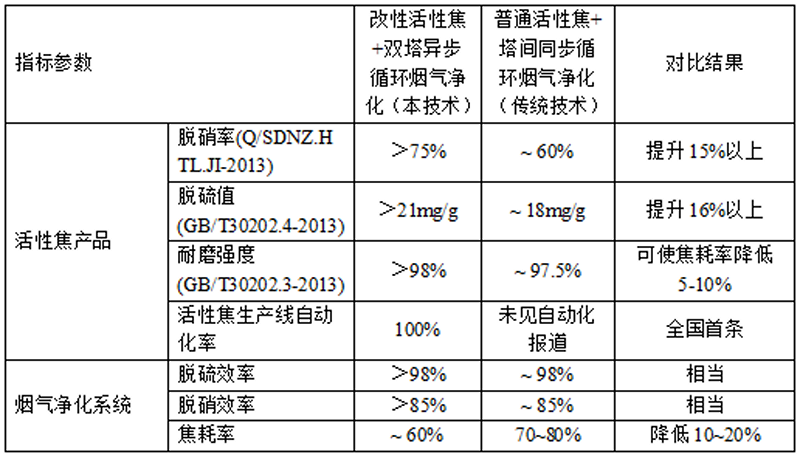 實(shí)現(xiàn)了鋼鐵工業(yè)煙氣的超低排放,顯著降低了污染物的排放水平。通過應(yīng)用本技術(shù),生產(chǎn)線所生產(chǎn)的高性能活性焦產(chǎn)品符合相關(guān)標(biāo)準(zhǔn)(GB/T30201-2013)要求、性能穩(wěn)定,保證了煙氣凈化系統(tǒng)所需活性焦的供應(yīng),生產(chǎn)各工序配套環(huán)保設(shè)施完善,清潔生產(chǎn)無廢水廢渣排放,煙氣可達(dá)超低排放標(biāo)準(zhǔn)要求;煙氣化系統(tǒng)脫硫效率>98%,脫硝效率>85%,二噁英濃度<0.1ngTEQ/Nm3,使污染物排放濃度達(dá)到鋼鐵超低排放要求。處理煙氣量近2000萬Nm3/h,污染物排放濃度均達(dá)到鋼鐵超低排放要求(顆粒物≤10mg/Nm3,SO2≤35mg/Nm3,NOx≤50mg/Nm3),實(shí)現(xiàn)年減排顆粒物1萬噸、SO2 14萬噸、NOx 4萬噸。