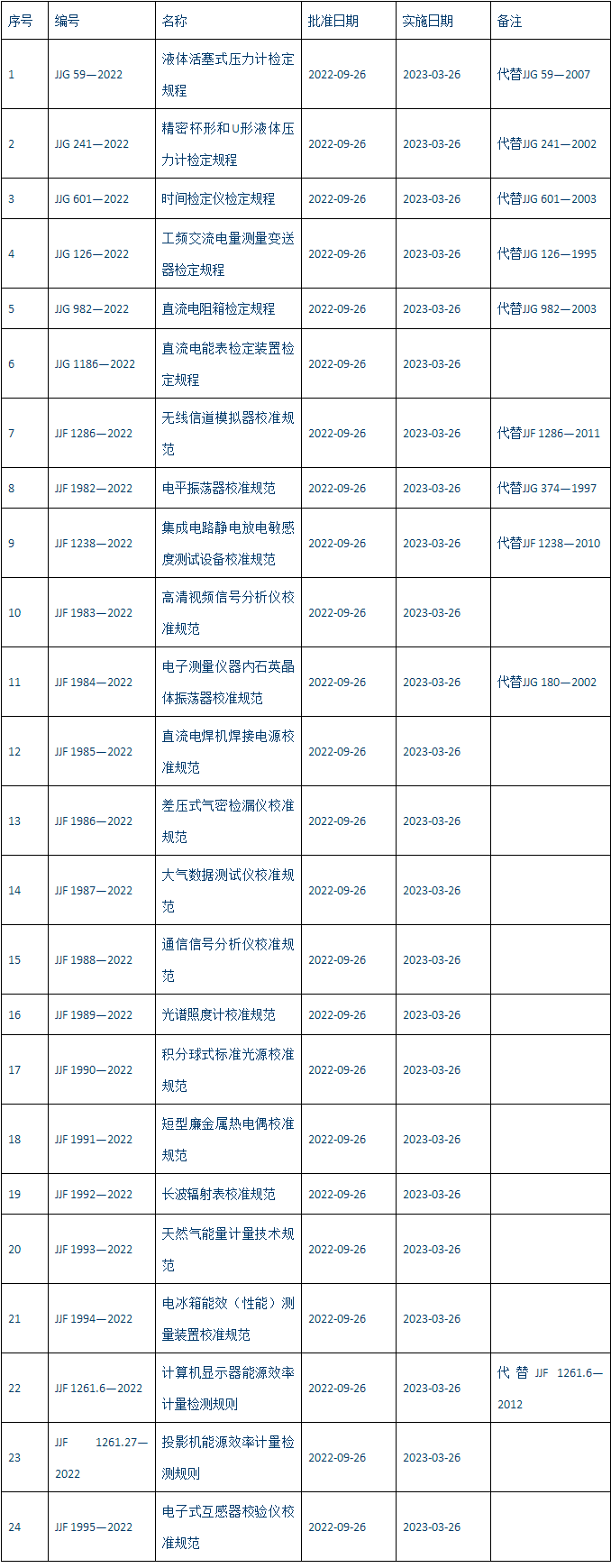 《液體活塞式壓力計(jì)檢定規(guī)程》等24項(xiàng)國(guó)家計(jì)量技術(shù)規(guī)范名錄