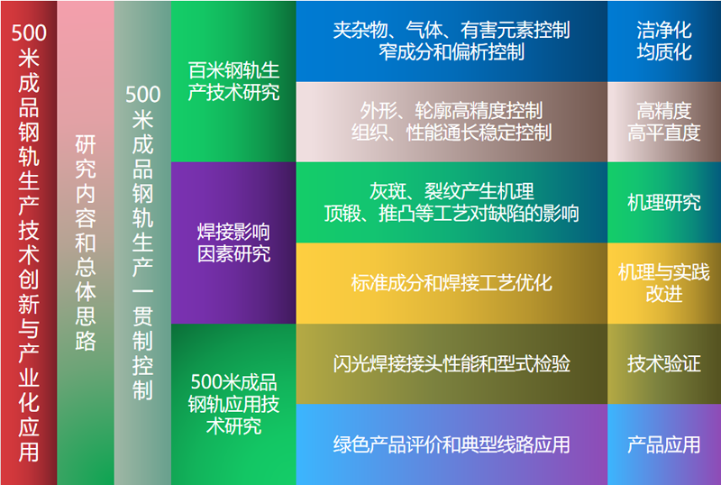 針對(duì)上述問(wèn)題與不足,構(gòu)建鋼軌潔凈化、均質(zhì)化冶煉和高精度軋制、高表面控制技術(shù)體系,依托先進(jìn)的鋼軌全萬(wàn)能連軋、在線余熱淬火、長(zhǎng)鋼軌焊接等生產(chǎn)技術(shù)裝備,通過(guò)企業(yè)主體、市場(chǎng)導(dǎo)向、產(chǎn)學(xué)研用深度融合的研發(fā)合作,集成鋼鐵企業(yè)500米成品鋼軌生產(chǎn)技術(shù),在鋼鐵企業(yè)內(nèi)部完成500米成品鋼軌生產(chǎn)和質(zhì)量管控。這一方面可以突破傳統(tǒng)長(zhǎng)鋼軌供給模式,縮短供應(yīng)鏈,延伸鋼軌生產(chǎn)產(chǎn)業(yè)鏈;另一方面可以從生產(chǎn)源頭進(jìn)一步保證母材和焊接接頭質(zhì)量穩(wěn)定性,提高路網(wǎng)建設(shè)長(zhǎng)鋼軌供給效率和安全性,實(shí)現(xiàn)鋼鐵企業(yè)生產(chǎn)500米成品鋼軌制造和直供線路鋪設(shè)的“快遞服務(wù)”。項(xiàng)目主要研究?jī)?nèi)容及總體思路,如圖2所示。