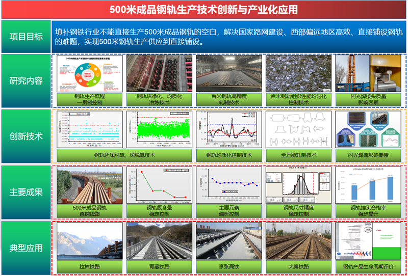 項(xiàng)目實(shí)施過(guò)程中,創(chuàng)新開(kāi)發(fā)應(yīng)用了長(zhǎng)鋼軌系列生產(chǎn)裝備和技術(shù)。中國(guó)鋼鐵工業(yè)協(xié)會(huì)組織的科技成果評(píng)價(jià)認(rèn)為:“500米成品鋼軌生產(chǎn)技術(shù)創(chuàng)新與產(chǎn)業(yè)化應(yīng)用項(xiàng)目研究成果,整體達(dá)到國(guó)際先進(jìn)水平”。研究?jī)?nèi)容、創(chuàng)新技術(shù)、主要成果和典型應(yīng)用,如圖3所示。