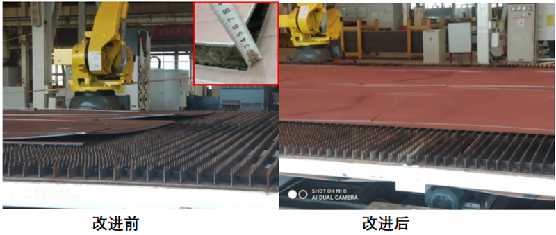 圖1 NM300TP耐磨鋼改進(jìn)前后下料翹曲程度對(duì)比