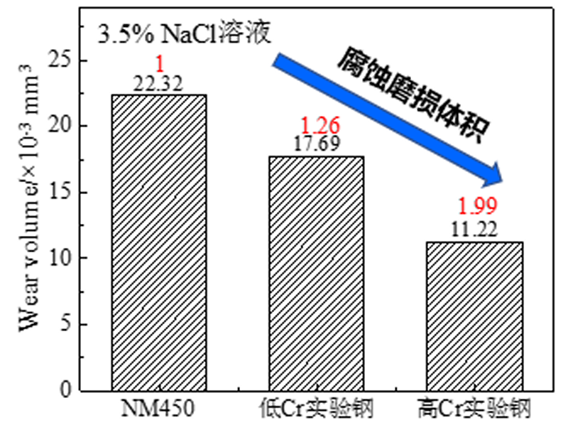 圖2新型耐腐蝕耐磨鋼與普通NM450耐磨鋼在腐蝕息環(huán)境下的磨損體積損失對(duì)比