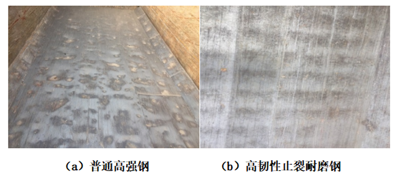 圖4 相同車型中高韌性止裂耐磨鋼NM450Tuf與普通高強(qiáng)鋼服役2年后對(duì)比
