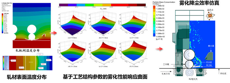 在近900℃高溫環(huán)境下,降塵液滴快速汽化導致對粉塵的捕集效率大幅下降。增大噴霧量可改善降塵效率,但加劇板帶表面溫降損失,影響熱制度。本項研究通過修正高溫霧化降塵慣性碰撞理論,開發(fā)自適應高溫霧化降塵關鍵技術和自激振蕩關鍵元件,解決降塵效率與板帶溫降智能協(xié)調的控溫控軋難題;構建熱軋降塵效率和提質效果測評的新方法及企業(yè)標準,大幅提高熱軋降塵效率,降低過鋼粉塵濃度。