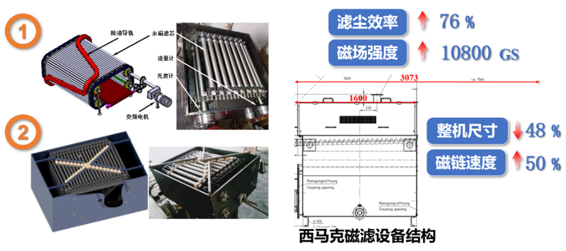 4、自主研發(fā)高密度永磁磁鏈的磁場強化技術,研制新型高磁場強度自清潔永磁磁鏈高效濾塵技術和裝備,大幅提高高壓除鱗、軋輥冷卻、霧化降塵水等含塵濁環(huán)水的在線回用效率,濁環(huán)水濾塵效率由1000L/min提高到1760L/min。