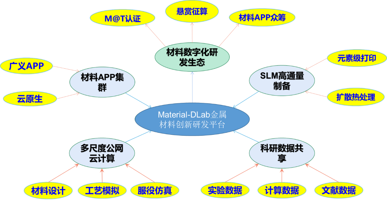 平臺的總體研制技術路線為:(1)設計高性能服務器集群架構,滿足日常材料設計、應用研發(fā)需求和偶發(fā)的大規(guī)模材料計算和仿真的算力需求。(2)選配國內(nèi)外知名材料計算、工藝仿真和服役模擬軟件,形成從原子尺度的第一性原理、分子動力學模擬計算,到微觀尺度的相圖計算、相場模擬,到宏觀有限元和材料服役評估的全尺度材料研發(fā)工具體系。(3)開發(fā)多尺度公網(wǎng)云計算調(diào)度系統(tǒng),搭載高性能服務器集群和全尺度材料研發(fā)工具體系,通過圖形化窗口排隊算法和公網(wǎng)智能路由技術開發(fā),實現(xiàn)全尺度計算資源的遠程計算、移動計算和排隊計算,滿足對于計算仿真工具與高性能計算(CPU/GPU)的使用需求。(4)研制材料APP系統(tǒng),通過對不同計算算法模型的參數(shù)化建模界面封裝、多形式APP調(diào)度算法的功能開發(fā)和云端生成功能開發(fā),降低計算仿真的使用門檻,滿足非計算仿真專業(yè)人員的研發(fā)需求。(4)開發(fā)科研檢測數(shù)據(jù)共享管理平臺,通過原始材料數(shù)據(jù)的半結構化上傳和各類測試設備的數(shù)據(jù)接口開發(fā),滿足一手試驗檢測數(shù)據(jù)的歸集管理和分權管理。通過開發(fā)基于“材料基因”的區(qū)塊鏈技術,整合相關資源,實現(xiàn)文獻、計算、試驗數(shù)據(jù)的統(tǒng)一管理,數(shù)據(jù)確權、價值評估和安全共享。(5)研制元素級高通量增材制備裝備,通過元素粉末微區(qū)合金化工藝開發(fā)和基于SLM(激光選區(qū)熔化)的動態(tài)量化混粉裝備開發(fā),實現(xiàn)不同成分宏觀塊體樣品的高通量制備。通過配置粉末前處理、激光制備、高溫熱處理和金相/硬度分析裝置,形成元素級高通量增材制備的整體解決方案。