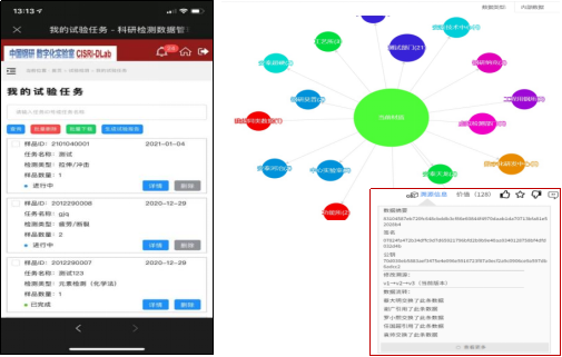 科研檢測數(shù)據(jù)共享管理子系統(tǒng)針對原始科研數(shù)據(jù)管理共享問題,可對試驗任務申請唯一編碼,并在項目賬戶下獲取試驗數(shù)據(jù),支持各類試驗設備、文獻數(shù)據(jù)的接入,并提供個人/團隊數(shù)據(jù)管理、跨團隊數(shù)據(jù)發(fā)現(xiàn)、一鍵試驗報告、動態(tài)評價考核等功能?;谠瓌?chuàng)性的材料基因特征和區(qū)塊鏈協(xié)議,實現(xiàn)了數(shù)據(jù)權屬標記和可用不可見服務,支持團隊內(nèi)部的數(shù)據(jù)安全共享和團隊之間的數(shù)據(jù)對等發(fā)現(xiàn),是建立團隊級、企業(yè)級數(shù)據(jù)礦山、實現(xiàn)科研數(shù)據(jù)資產(chǎn)化的高效工具(見圖4)。