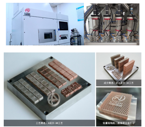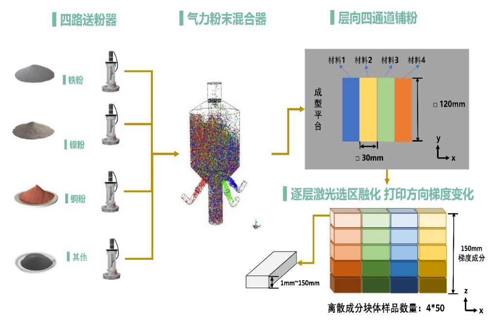 該技術改變傳統(tǒng)3D打印以合金粉為原料的模式,以多種元素粉為主要原料,通過動態(tài)量化混粉,在SLM成型的同時完成合金化過程(見圖6)。項目團隊突破了微區(qū)冶金擴散動力學、粉末動態(tài)定量控制、高溫擴散模擬等核心技術,自主設計開發(fā)的3D-Alloyer高通量制備系統(tǒng)包含定量送粉模塊、實時混粉模塊、多通道鋪粉模塊和高通量打印控制模塊,可一次性制備上百種不同成分的力學性能樣品(見圖7)。