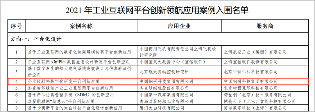 該平臺2020年獲國資委國有企業(yè)數(shù)字化轉型典型案例“材料產(chǎn)業(yè)鏈創(chuàng)新云服務平臺”稱號;上榜2020年工信部大數(shù)據(jù)產(chǎn)業(yè)發(fā)展試點示范項目“鋼鐵材料產(chǎn)業(yè)鏈應用大數(shù)據(jù)平臺”;上榜工信部“2021年工業(yè)互聯(lián)網(wǎng)平臺創(chuàng)新領航應用案例”;入選2021年中央網(wǎng)信辦、國務院辦公廳等聯(lián)合組織的“國家區(qū)塊鏈創(chuàng)新應用試點”示范單位;入圍2021年度央企熠星大賽復賽項目“基于元素粉末3D打印的高通量制備平臺”。在中國金屬學會的科技成果評價會上,謝建新院士、張統(tǒng)一院士和段文暉院士等11位評審專家一致認為,該平臺已達到國際領先水平,可促進行業(yè)級數(shù)字化研發(fā)生態(tài)的建立和成長,經(jīng)濟和社會效益顯著。